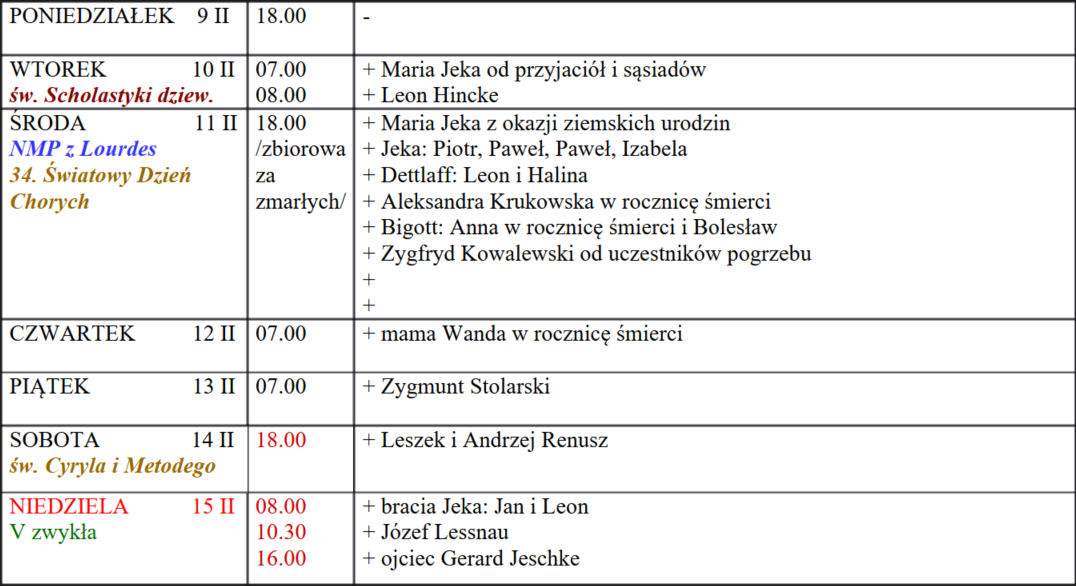 (o 17.00 – w soboty i Wigilię uroczystości nakazanych – Msza święta z niedzieli lub uroczystości);